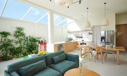 Đáp ứng yêu cầu về không gian sống hòa mình vào thiên nhiên, các khoảng xanh được bố trí ở khắp ngôi nhà.